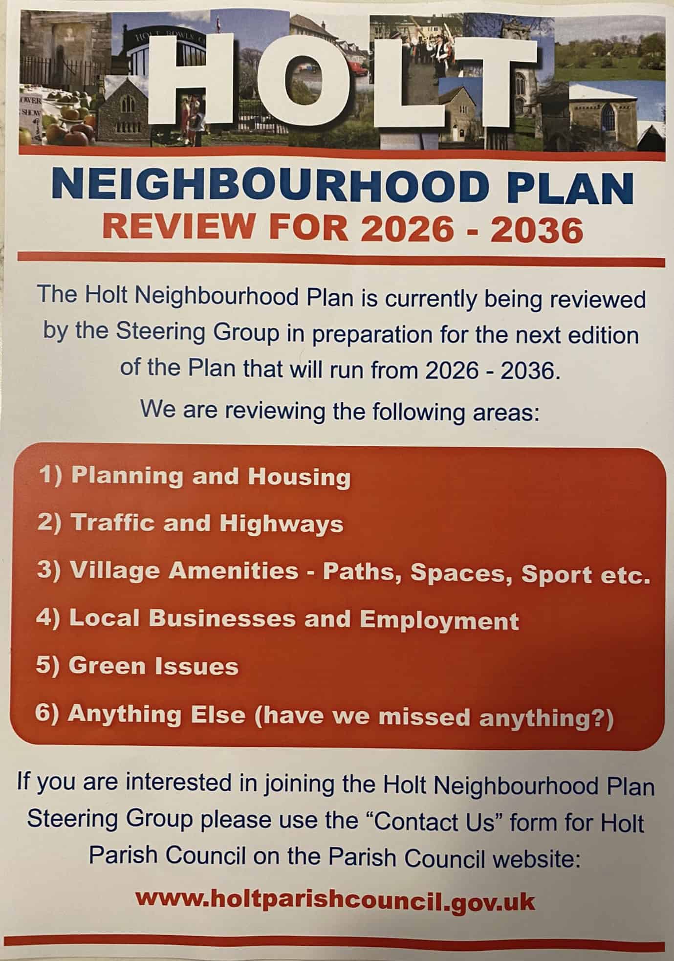 If anyone is interested in being part of the Steering Group please use the contact us form for Holt Parish Council. The Holt Neighbourhood Plan review cannot take place without residents joining Councillors as a Steering Group. We aim to meet monthly and get the review complete in 2025. Feedback will be provided at each monthly Parish Council meeting.